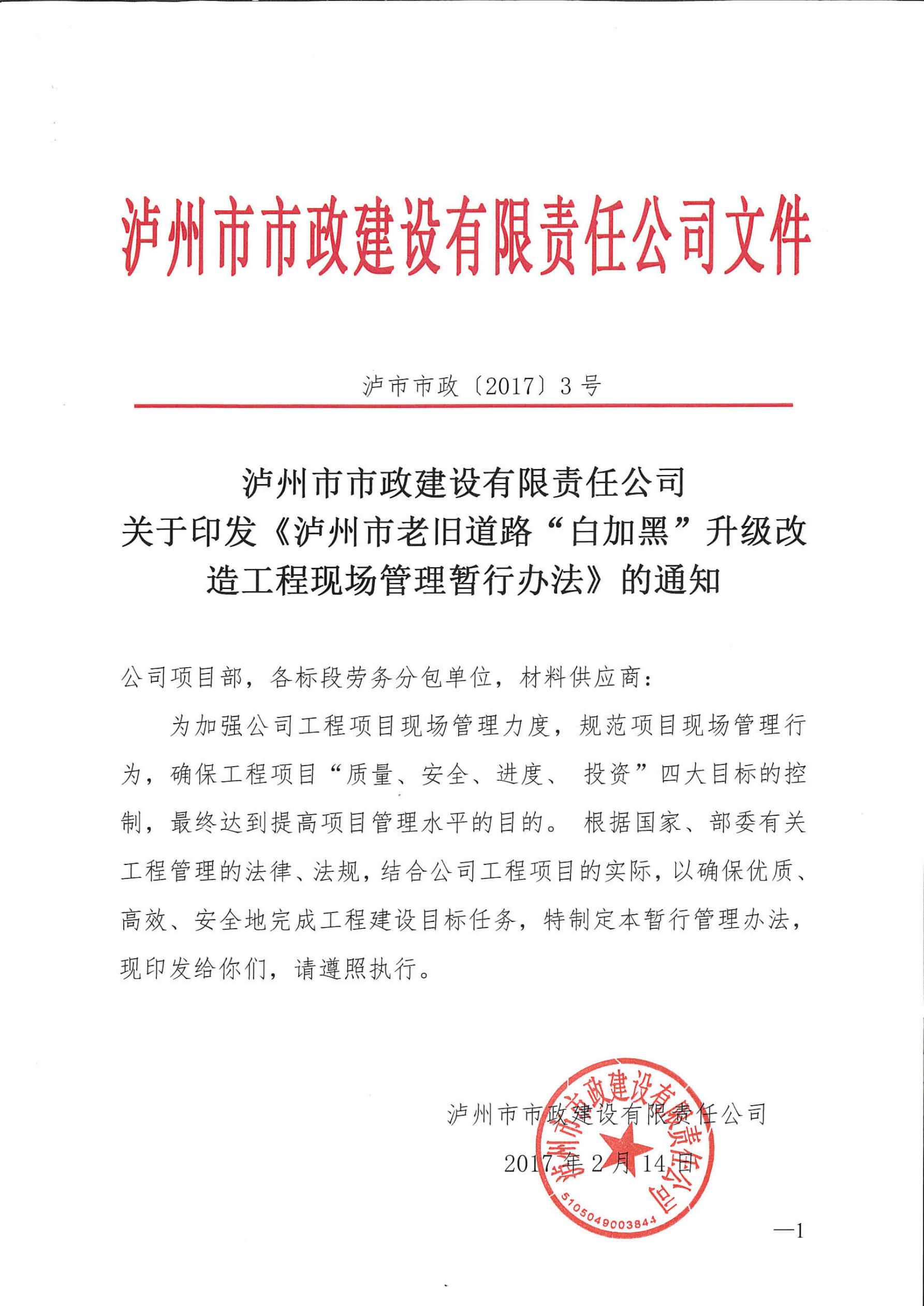 瀘州市市政建設有限責任公司自2016年9月組建以來,主動承擔社會責任,積極履行社會義務,體現(xiàn)企業(yè)價值,特別是從2016年11月建設瀘州市老舊道路“白加黑”升級改造項目開始,在項目實施過程中,主動抓好質(zhì)量安全和創(chuàng)文攻堅齊頭并進。