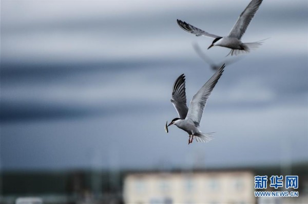在中國(guó)最大內(nèi)陸咸水湖——青海湖,一只水鳥捕捉到湟魚后飛離水面(2015年6月24日攝)。
